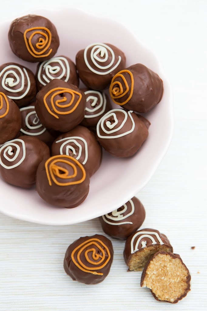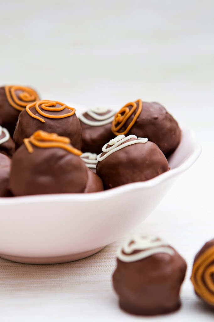A golyókat egy bonbonmártó villa ( azt hiszem így hívják, nekem nincs) vagy fogpiszkáló segítségével megmártjuk a csokiban, kicsit lecsepegtetjük és sütőpapírra rakjuk őket. Miután a golyókon a csoki megköt, körülbelül 1 óra után díszítettem az üzletekben kapható cukormázzal, de darált diót is szórhatunk a tetejére.