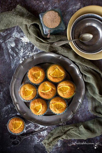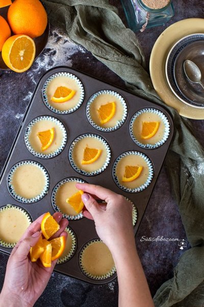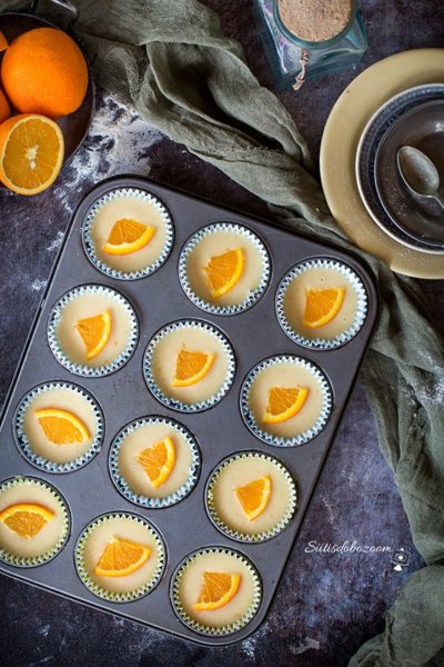 Egy tálba szitálom a lisztet, a sót és a sütőport. Egy másik tálban elkeverem a tejet, a tojást és a cukrot, majd utána hozzá adom az olajat, ezt is elkevertem. Hozzáöntöm a nedves hozzávalókat a szárazakhoz, és elkeverem, amíg össze nem áll sűrű tésztává. A narancslét és a narancs héját még hozzá teszem és ezt is jól elkeverem. Kivajazom egy muffin sütőforma tetejét – erre azért van szükség, hogy a megemelkedő muffinokat könnyen ki lehessen venni, ezt nemrég olvastam. 🙂 Beleteszem a formába a muffinsütő papírokat. Belekanalazom a tésztát, kb. a 3/4-ig és a tetejét díszítem naranccsal. Én egy kisebb narancsot karikákra vágtam, majd ezt negyedeltem, így kerültek a muffinok tetejére. Ebből a mennyiségből 12 darab normál méretű (7 cm-es) muffin lesz. 25 percig sütöm.