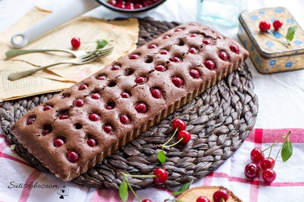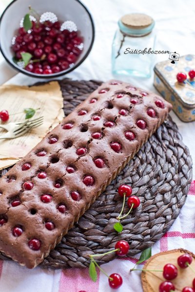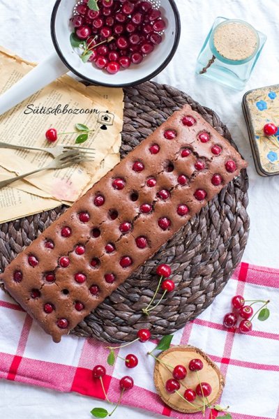 A vajat megolvasztom és minden hozzávalóval együtt egy keverőtálba öntöm és jól elkeverem. Kivajazok és lisztezek egy közepes méretű tepsit (én készítettem ezzel a hosszúkás formával és egy 20cm-es kerek tortaformával ebből az adagból.) Előmelegítem a sütőt 200 fokra és amíg melegszik, a süti tetejére szórom a meggyet. 15-20 percet sütöm, tűpróbával ellenőrzöm. Kicsit hagyom hűlni és tejszínhabbal kínálom.