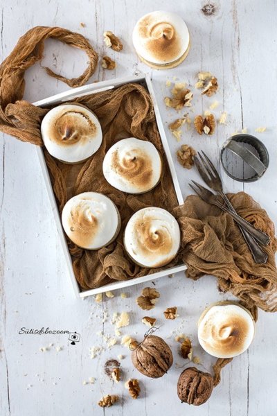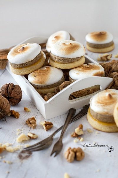 Készítsük el a tojásfehérje habot. Kezdjük el felverni a fehérjéket és lassan adagoljuk hozzá a porcukrot és a citromlevet. Én gőz felett vertem fel, de nem szükséges így. Kanalazzuk rá a diós “tésztára” és a 100 fokos sütőben szárítsuk ki egy negyed óra alatt. (én légkeverésre állítottam a sütőt).