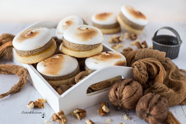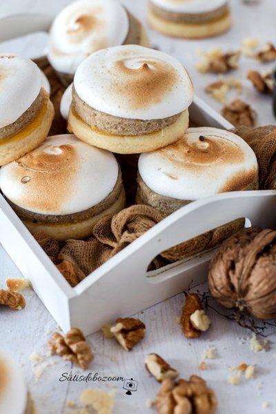 Amíg sül, nyújtsuk ki a linzertésztát ugyanúgy mint a diós tölteléket, és ugyanakkora köröket szúrjunk ki belőle. Tegyük rá egy sütőpapírral bélelt sütőformára és ha elkészült a habos diós, tegyük be a helyére, alsó-felső sütésre kapcsolva asütőt és 180 fokon süssük 8-10 percig.