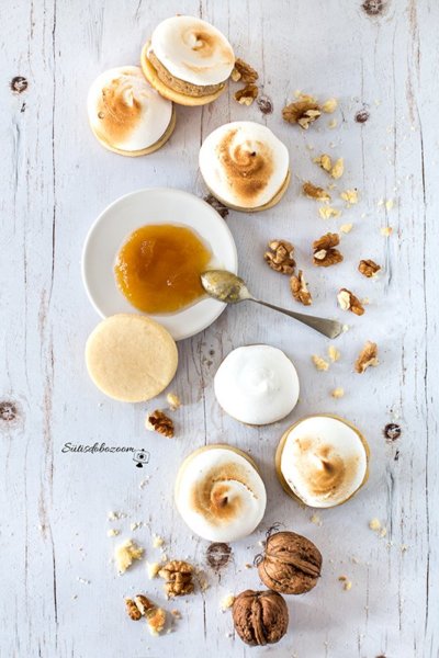 Ha minden kihűlt, akkor baracklekvárral ragasszuk össze a linzereket és a habos-diós tölteléket. Ebből a mennyiségből nekem 16 darab süti készült.