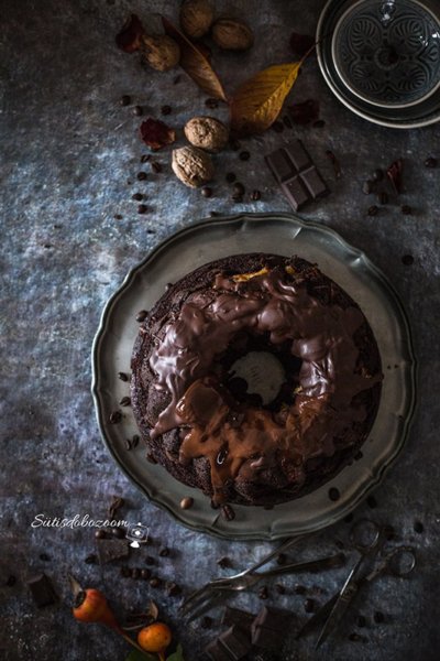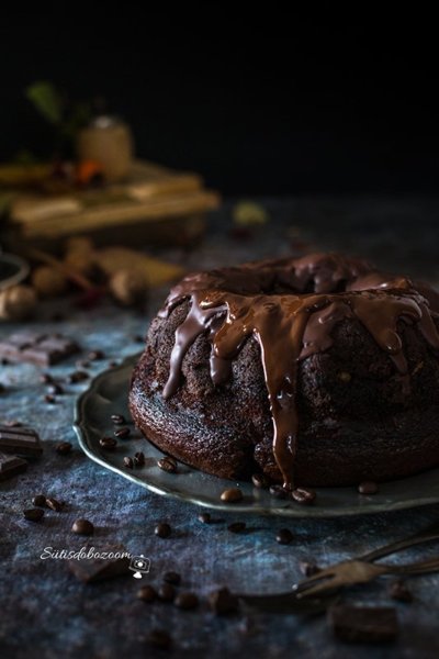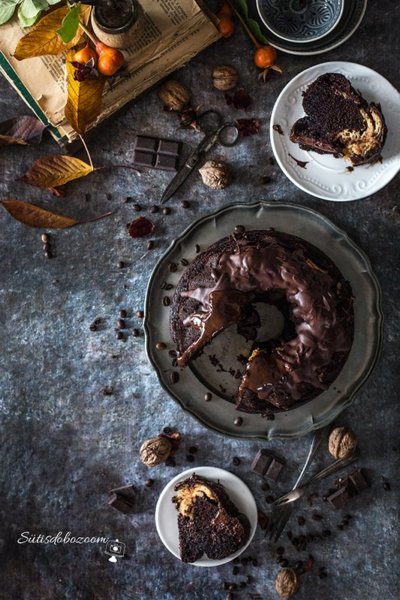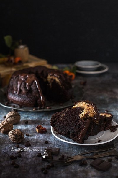 Ez a kuglóf nem az a tipikusan szárazabb hatású kuglóf, inkább olyan “latyakos” tésztájú (jobb szó nem jut róla eszembe), így kézzel nem, inkább villával együk meg ha felszeleteltük. Kicsit macerásabb is az elkészítése abból a szempontból, hogy sokáig kell sütni és sokáig kell hagyni hűlni a formában. Így ha csak kevés időnk van elkészíteni, ne ezt válasszuk. Nem émelyítően édes, a kávétól és a tetejére csorgatott étcsokitól kicsit fanyarkásabb az ízvilága. Ha felvágjuk, van benne egy kis meglepetés, mert nem szimplán csokiból áll, van egy krémsajtos réteg is benne, amitől sokkal látványosabb és finomabb lesz.