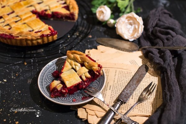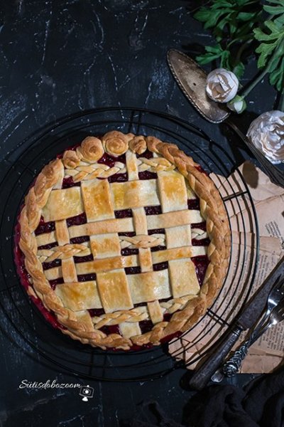 Amíg a töltelék hűl, vegyük elő a tésztánkat és a feléből nyújtsunk ki egy korongot, ami a pite alapja lesz. Én 22 cm-es piteformát használtam. Belesimítottam a tésztát, az alját több helyen is megszúrtam villával és visszatettem a hűtőbe. Ugyanis a tetejére a maradék tésztából csíkokból mintát készítettem. Miután mindennel elkészültem előmelegítettem a sütőt 200 fokra és a hűtőből kivettem a pite alját. Beleöntöttem a tölteléket és a formára vágott csíkokból mintát készítettem a tetejére (bármilyet lehet). Megkentem egy felvert tojással és 32 perc alatt megsütöttem.