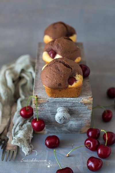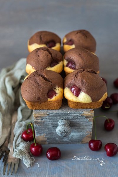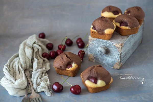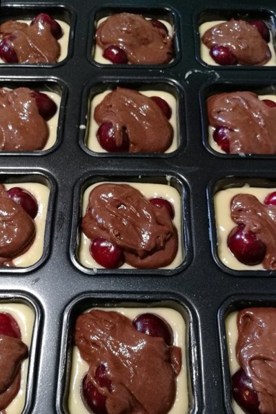A tojásokat a cukorral és az olvasztott vajjal habosra keverem. Hozzáöntöm a tejet és a sütőporral, citromhéjjal elkevert lisztet, és jól elkeverem. Kizsírozok egy kisebb tepsit (kb 20×20 cm) vagy egy kis kockákra formázott tepsit (Tescoban lehet kapni) és beleöntöm a tészta felét. Beleteszem a cseresznyéket a sima tepsibe csak szórjuk random bele, a kocka formájú tepsibe én 4-4 szemet tettem. A tészta másik feléhez hozzákeverem a kakaóport, jól eldolgozom benne majd a cseresznyés világos tészta tetejére kanalazom. 170 fokos előmelegített sütőben aranybarnára sütöm (kb. 20-25 perc).